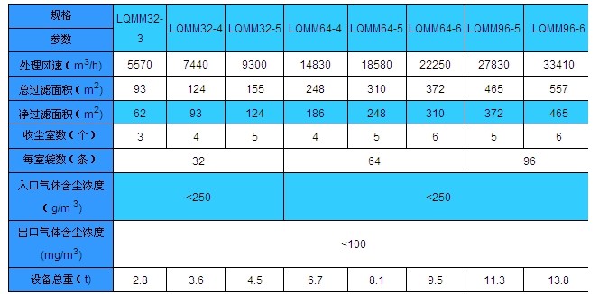 氣箱脈沖袋式除塵器LQMM型煤磨專用氣箱脈沖袋式除塵器技術參數表