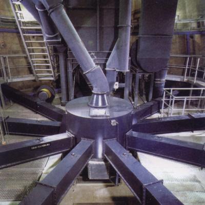 均化庫庫頂布料一般選用圓柱形生料分配器,該分配器充氣室用兩層滌綸纖維作充氣材料,以中壓離心鼓風(fēng)機(jī)供氣。經(jīng)流態(tài)化的生料由生料分配器通過斜槽多點均勻入庫。