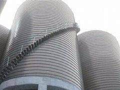 螺旋式鋼板倉(cāng),它是由鋼板一層層對(duì)折鏈接起來(lái)的,其結(jié)構(gòu)決定了它鋼板必須薄,只適用于5000噸以下的小庫(kù)。其密封性好,可以存放存放水泥、粉煤灰、糧食等各種粉末狀物質(zhì)。它壁薄,壽命相比焊接倉(cāng)短。